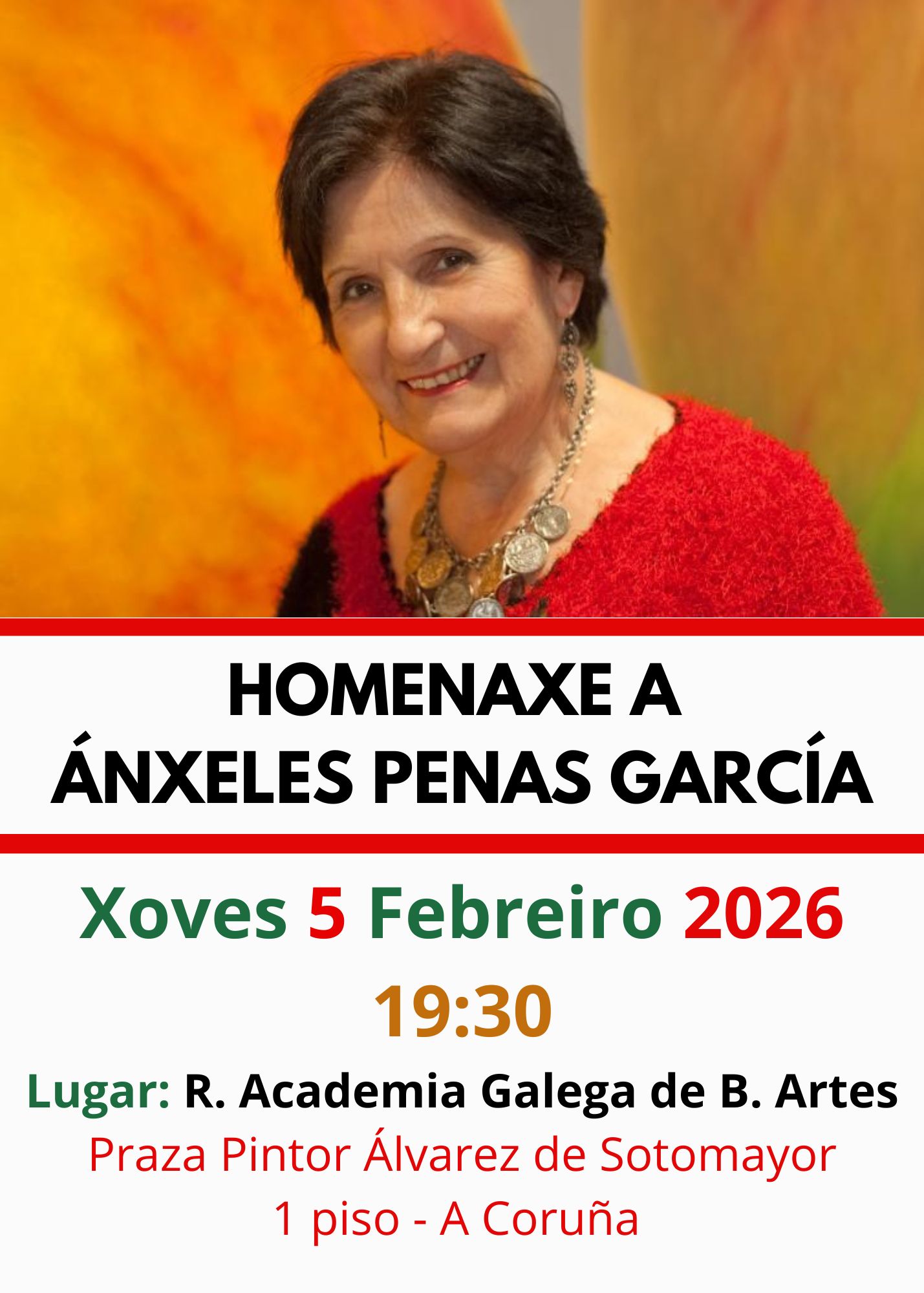 A Real Academia Galega de Belas Artes, creada no 1849 para fomentar a práctica, o estudo, contribuír á salvagarda, á sensibilización das artes e do patrimonio cultural galego, na súa Asemblea de 31 de Xaneiro de 2015, decidiu instituír o “Día das Artes Galegas”. Motivo para a exaltación, divulgación e promoción da creación en Galicia. E arredor da xornada un sólido argumento: confín habitado dende a Prehistoria, de antolóxicos monumentos megalíticos, emporio na Idade dos Metais, de sobranceiros ourives, de incontables e estratéxicos castros, arrodeados de lendas; Gallaecia de portos, faros, de enclaves romanos e suevos, que deron paso á humanización do territorio en ribeiras sacras, encrucillada de camiños a Compostela, para o nacemento do Románico [...]