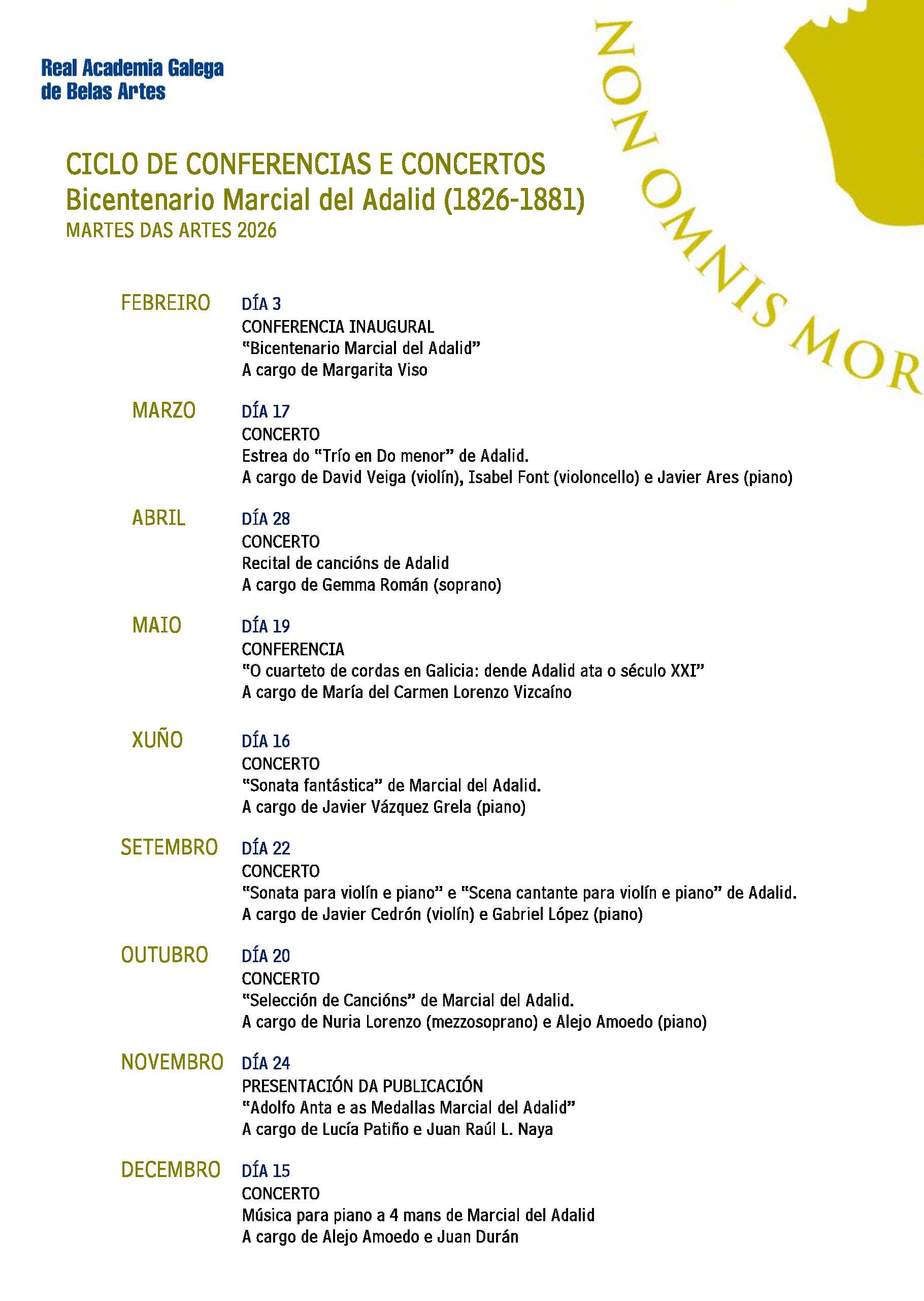 A Real Academia Galega de Belas Artes, creada no 1849 para fomentar a práctica, o estudo, contribuír á salvagarda, á sensibilización das artes e do patrimonio cultural galego, na súa Asemblea de 31 de Xaneiro de 2015, decidiu instituír o “Día das Artes Galegas”. Motivo para a exaltación, divulgación e promoción da creación en Galicia. E arredor da xornada un sólido argumento: confín habitado dende a Prehistoria, de antolóxicos monumentos megalíticos, emporio na Idade dos Metais, de sobranceiros ourives, de incontables e estratéxicos castros, arrodeados de lendas; Gallaecia de portos, faros, de enclaves romanos e suevos, que deron paso á humanización do territorio en ribeiras sacras, encrucillada de camiños a Compostela, para o nacemento do Románico [...]